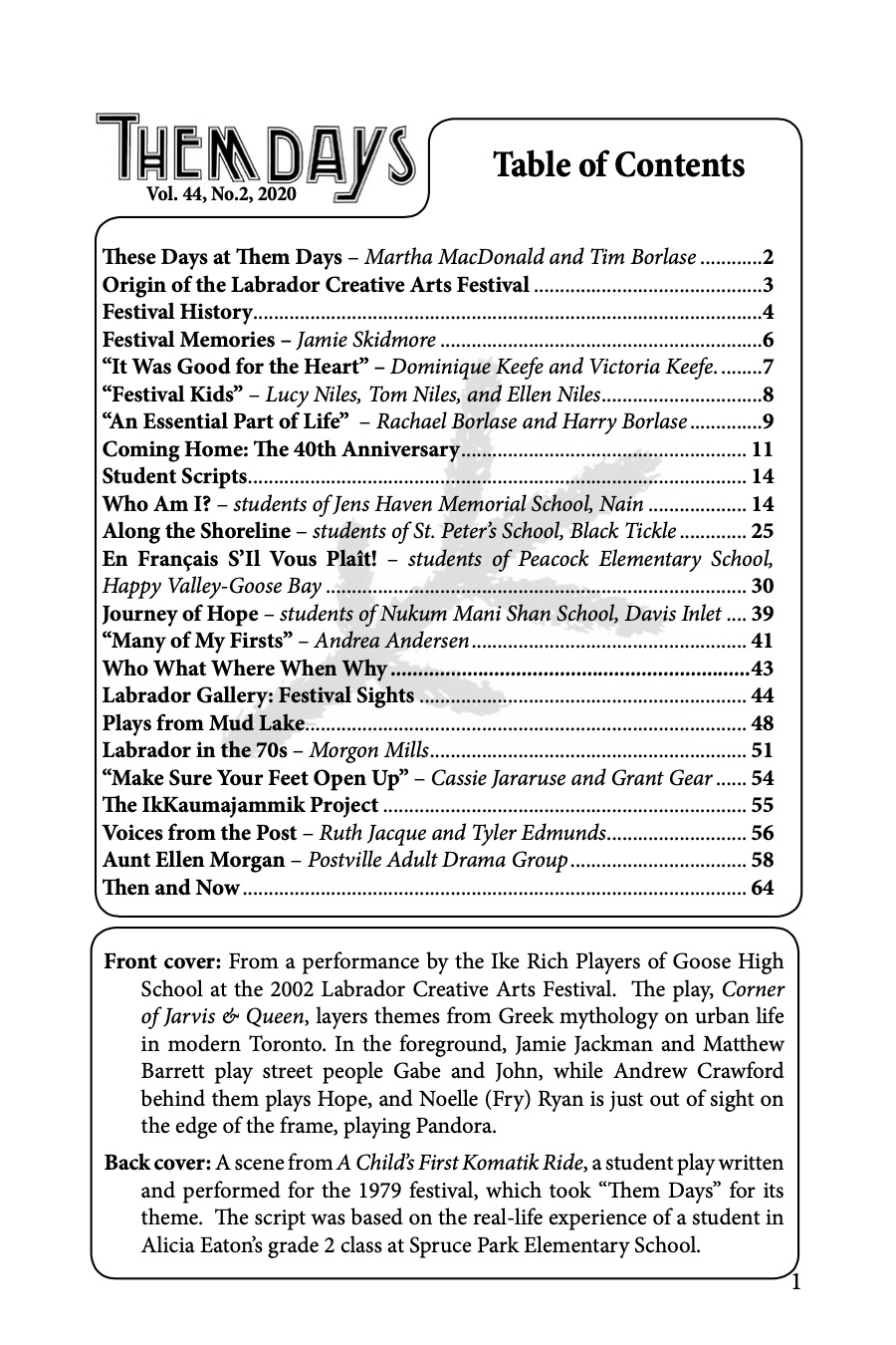 “This issue contains festival history, memories of performances, scripts, pictures and interviews. We hope it will bring back memories of shows seen, workshops enjoyed, and new and lasting friendships made during the long duration of the Labrador Creative Arts Festival.” – Martha MacDonald and Tim Borlase