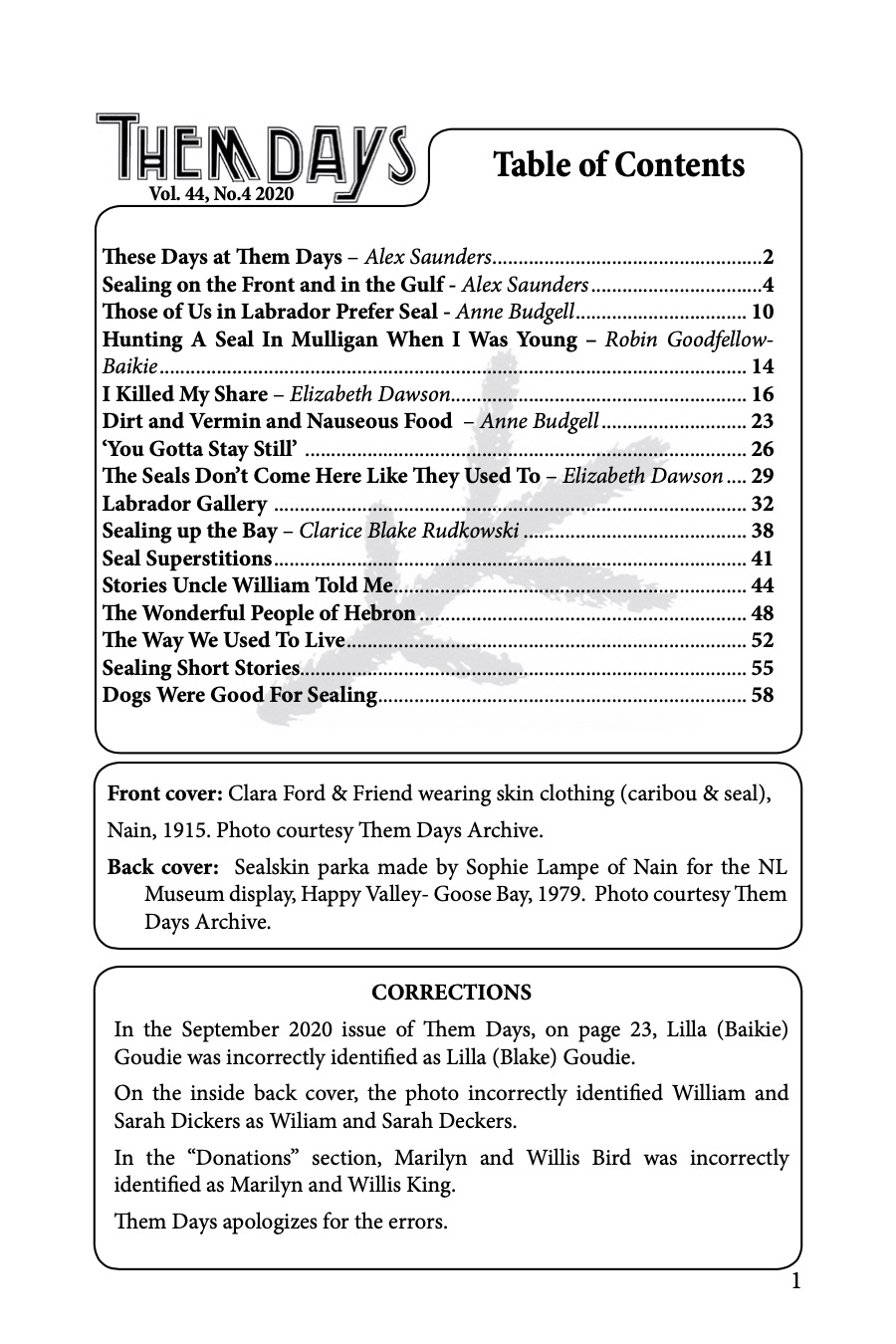Front Cover: Clara Ford & Friend wearing skin clothing (caribou & seal), Nain, 1915. Photo courtesy Them Days Archive.