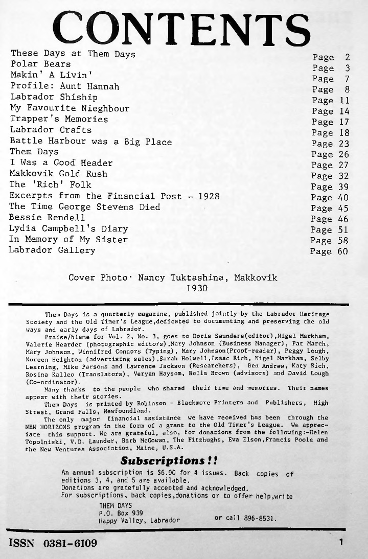 This issue of Them Days have exclusive stories that came from various hunters and trappers, read their stories about their trips to hunt for polar bears in  I Almost Saw One, I Almost Shot Two, and I’ve Killed Three. Take in the the joyful story of Honorah Hammond, more commonly known by the community of Pinware as, Aunt Hannah. Take in the Labrador craft of building snowshoes with steps to build the frame and filling them in with caribou hide.