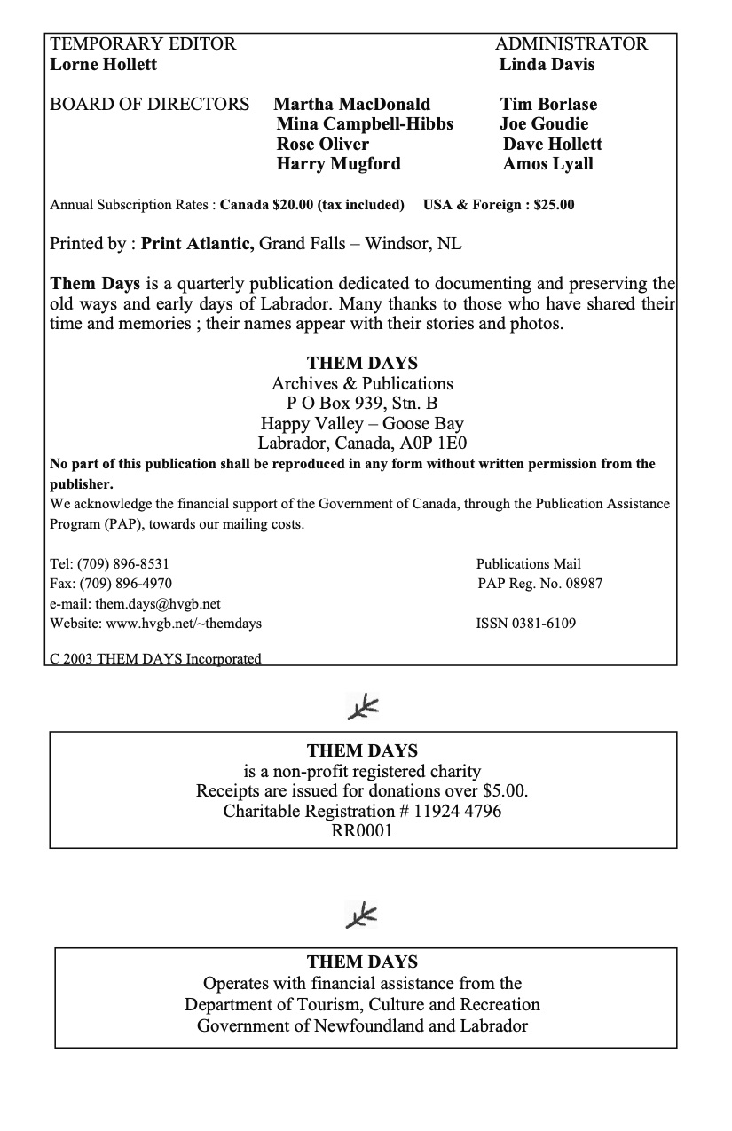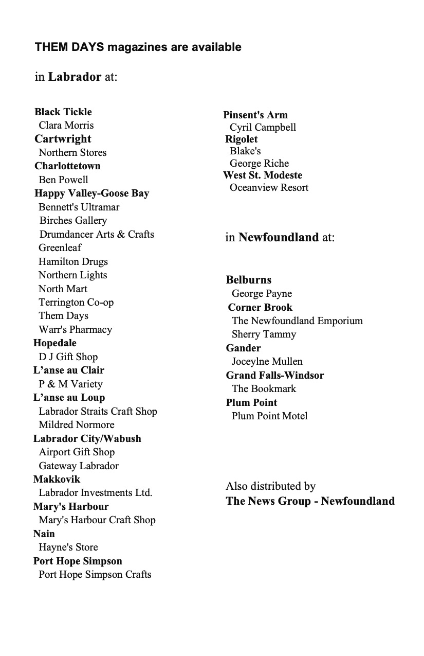 Many stories of V.S.O. (Voluntary Service Overseas) of Labrador with new people coming in and old people stepping away. When accepted for V.S.O., one woman learns valuable lessons and a love for the land of Labrador. Smaller communities welcome outsiders with open arms, gifts, and places to stay all out of hospitality. Excerpts from several journals describes how the visitors to Labrador spend their months. And many more stories included in this issue of Them Days.