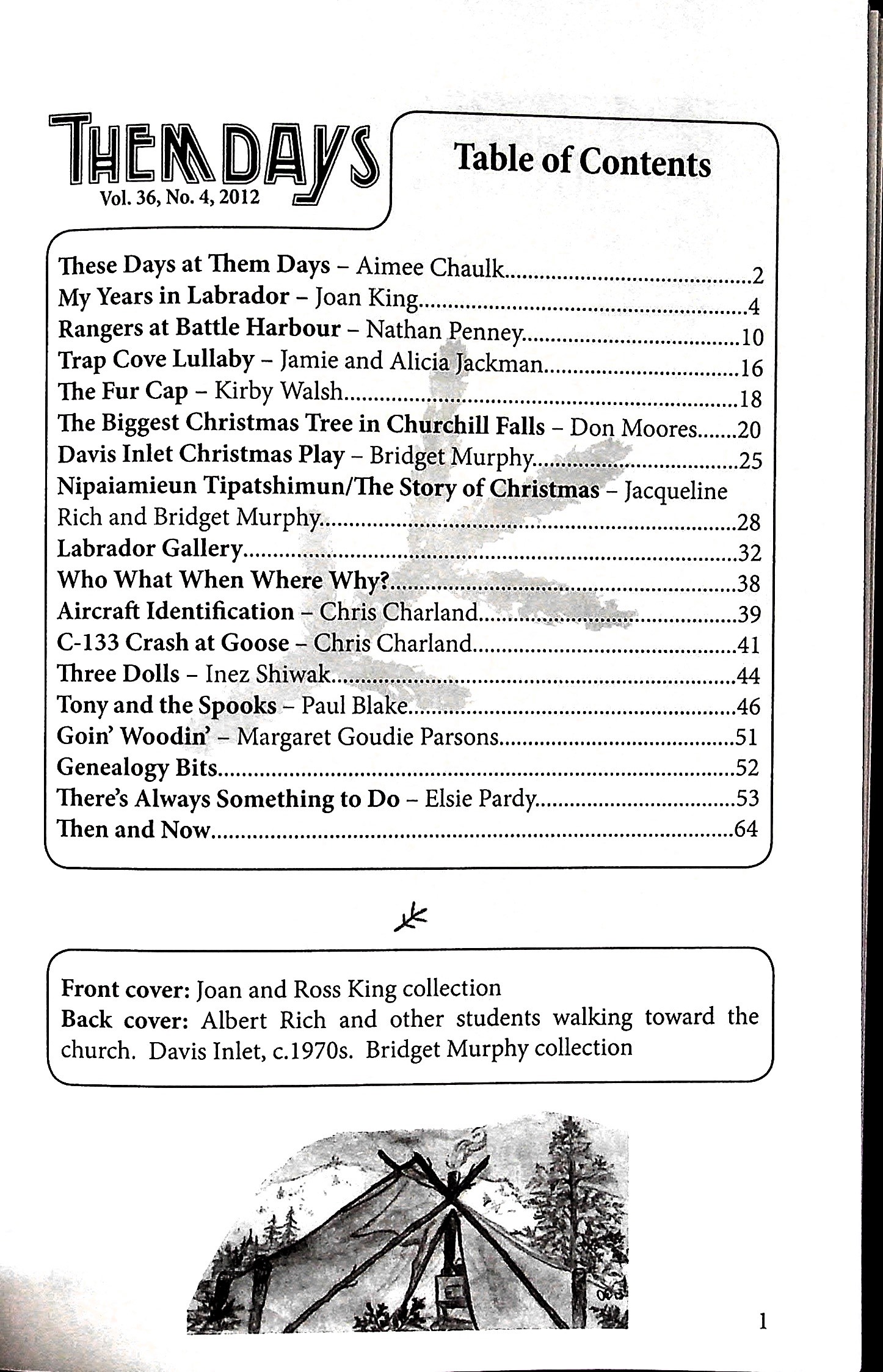 Them Days had our culture Days event. My Years In Labrador is an issue by Joan King. Nathan Penney joined the Newfoundland Ranger’s in 1940’s. Jamie and Alicia Jackman wrote a song called Trap Cove Lullaby. Kirby Walsh always went home for Christmas in Cartwright during his courses at Memorial University. Don Moores says he always had the biggest tree in Churchill Falls. Bridget Murphy says they always had a Christmas concert in class. Labrador Gallery on page 32. C-133 Crash at Goose by Chris Charland. Inez Shiwak made dolls with her, her mother, and her grandmother. Paul Blake bought his first guitar from Hudson Bay Company Store. The most memorable time for Margaret Goudie Parsons was went she went wooding with her dad. Roger Snook is from Gander, Nfld. Elsie Pardy’s parents were Roland and Grace McDonald.