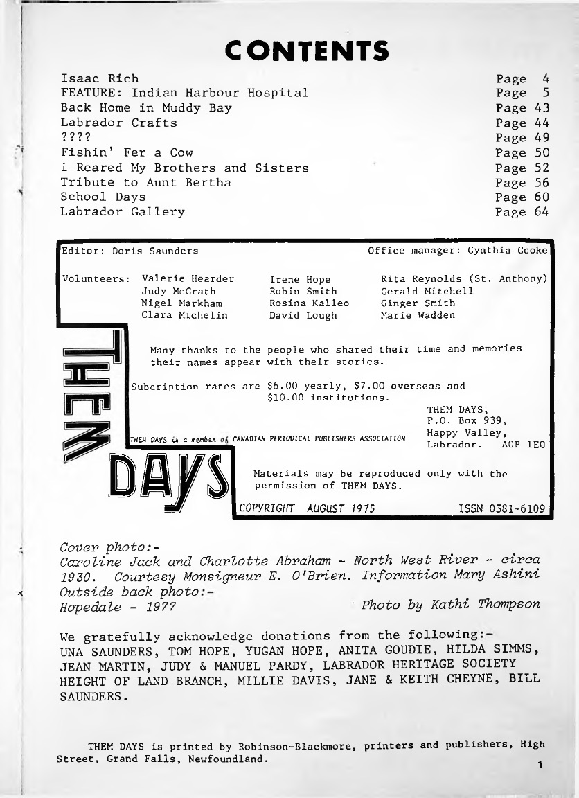 This issue of Them Days contains a series of entries of a nurse in Indian Harbour, Labrador which describes the history of the patients, hospital workers and residents of the second International Grenfell Association hospital through 1911-1940. These entries have been quoted fromĀ Among The Deep Sea Fishers (ADSF) andĀ Northern Nurse (NN). Learn about the Labrador craft of dancing dolls, wooden dolls carved by pocket knives made to move around and dance.