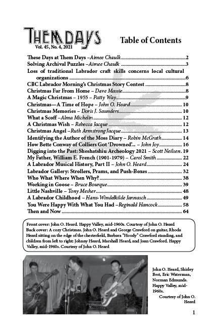 This general issue tells the story of music in Happy Valley, starting where John Heard left off in Vol. 17, No. 3. It also tells the story of the workers from Argyle Municipality, NS, who came up to Goose Bay to work in construction on Base, building several buildings on the Canadian Side and Spruce Park. We also learn about what life was like for a child growing up in the Moravian Mission in Nain during the 1880s. The Labrador Gallery features photos of prams, strollers, and push-boxes. Also includes some heartwarming Christmas stories!