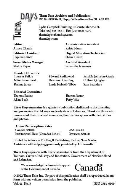 A general issue, with stories ranging from a first-person account of Moravian missionaries in the 1800s, tales from the whitefish fishery at Lobstick, the construction of Goose Bay, and more!
