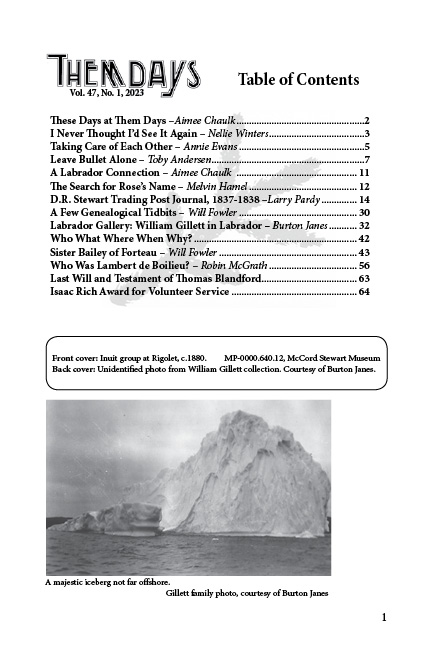 Vol. 47, No. 1 is out now, the first edition to come to 2023. Read about the journey of following a trail of relatives that lead to Labrador in hopes to find new connections all the way from New Zealand. Find out how two came together and found family across waters. A journal dating back to the late 1830’s for a trading post out on the land. Stories of Sister Bailey tell about the traveling nurse between 1905 to 1907 working hard to help who she could. Many more stories to enjoy in this issue of Them Days.